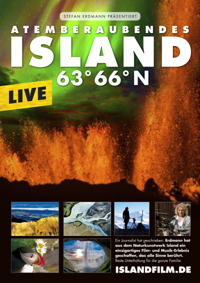 ISLAND 63° 66° N - Atemberaubend faszinierend Eine bildgewaltige Filmreise auf der größten Vulkaninsel unseres Planeten. Ein Journalist hat geschrieben: „Stefan Erdmann hat aus dem Naturkunstwerk Island ein einzigartiges Film- und Musik-Erlebnis geschaffen, das die Sinne berührt. Eine Hommage an Island und unseren Planeten. Gebannt sitzt man da und lauscht den Kommentaren Erdmanns und kann kaum fassen, was auf der Leinwand zu sehen ist.“ Stefan Erdmann präsentiert seine faszinierende Live-Film-Show ISLAND 63° 66° N mit spektakulären Filmaufnahmen. Er kennt Island zweifelsohne besser als viele Isländer selbst, denn er hat die größte Vulkaninsel unseres Planeten in den letzten 15 Jahren fast 30mal bereist und in sagenhaften Momenten erlebt und gefilmt. Erleben Sie bei dieser Filmreise knapp zwei Stunden Urlaub für Augen, Ohren und Seele.